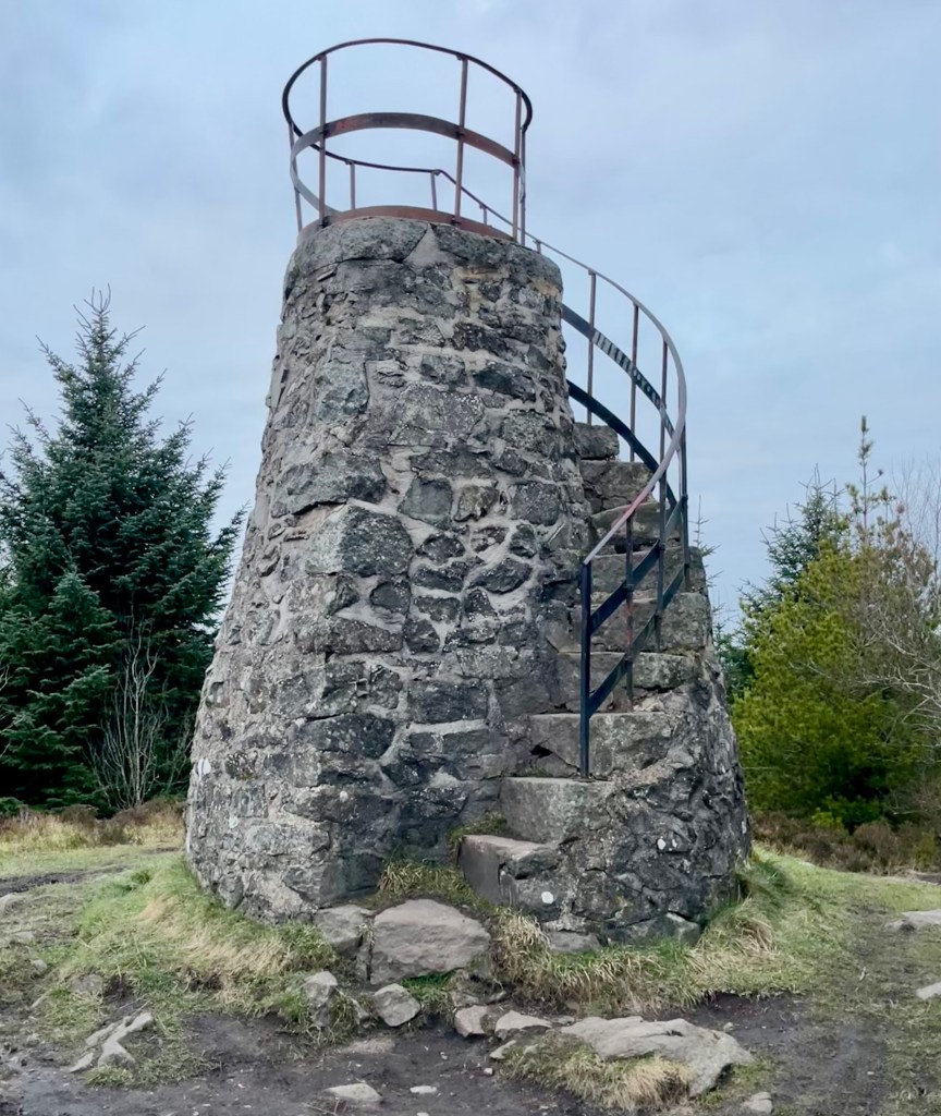 Though not very high – neither tower nor hill – Tappie is a popular destination for walkers and mountain bikers alike after negotiating a variety of woodland trails through Kirkhill Forest.
